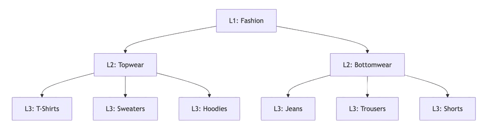 Categories follow a three-level hierarchy (L1 → L2 → L3) in Fynd Commerce to organize products and enhance discoverability across your catalog. Each level serves a distinct purpose:
