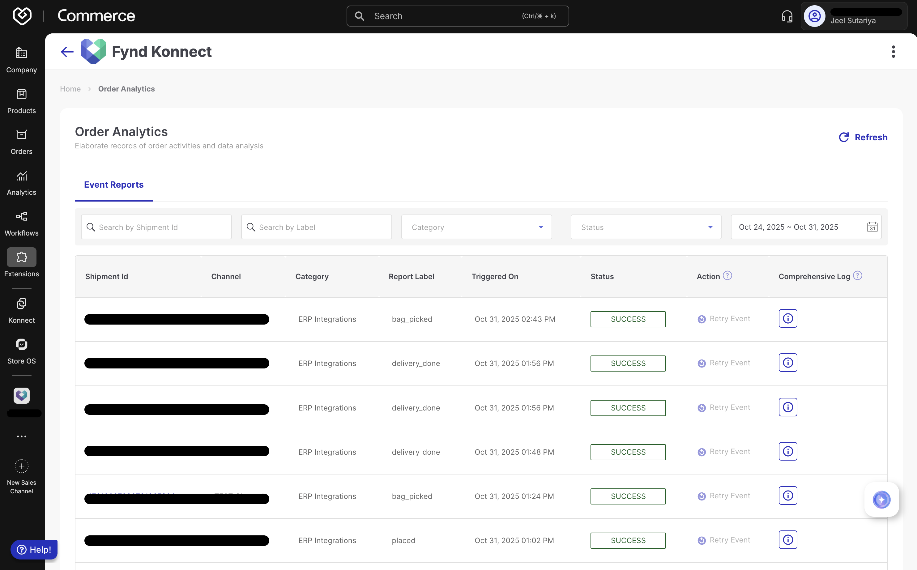 }The Order Analytics section provides comprehensive visibility into all event notifications between Fynd Platform and your integrated systems. This centralized dashboard enables you to track, troubleshoot, and analyze real-time data exchanges, ensuring quick resolution of any notification delivery issues. Event logs are retained for up to 1 month, providing sufficient historical data for debugging and audit purposes.
