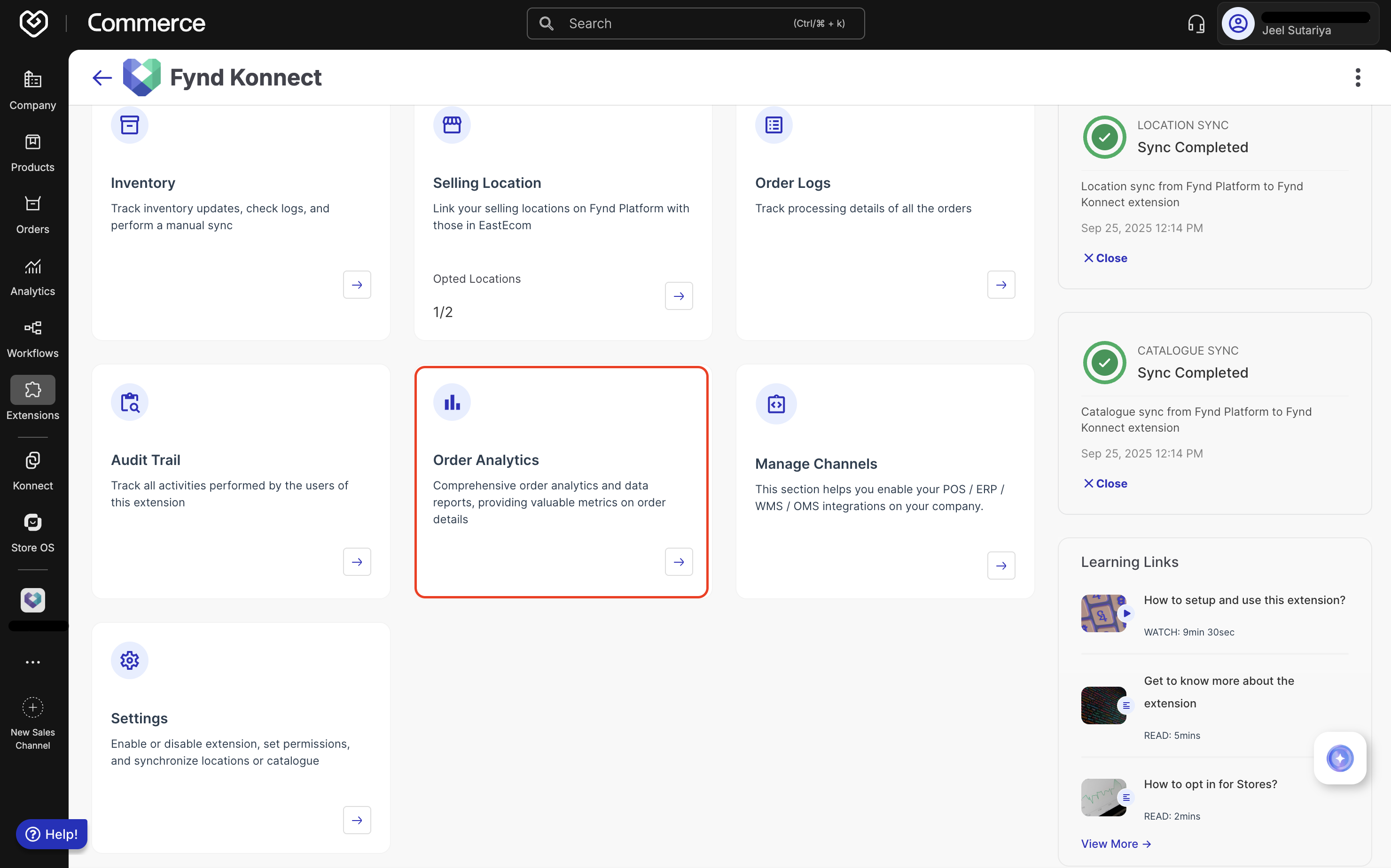- Access Fynd Konnect Channel: Navigate to your Fynd Commerce panel and click Extensions from the left sidebar. Locate and click Fynd Konnect from the channels list.