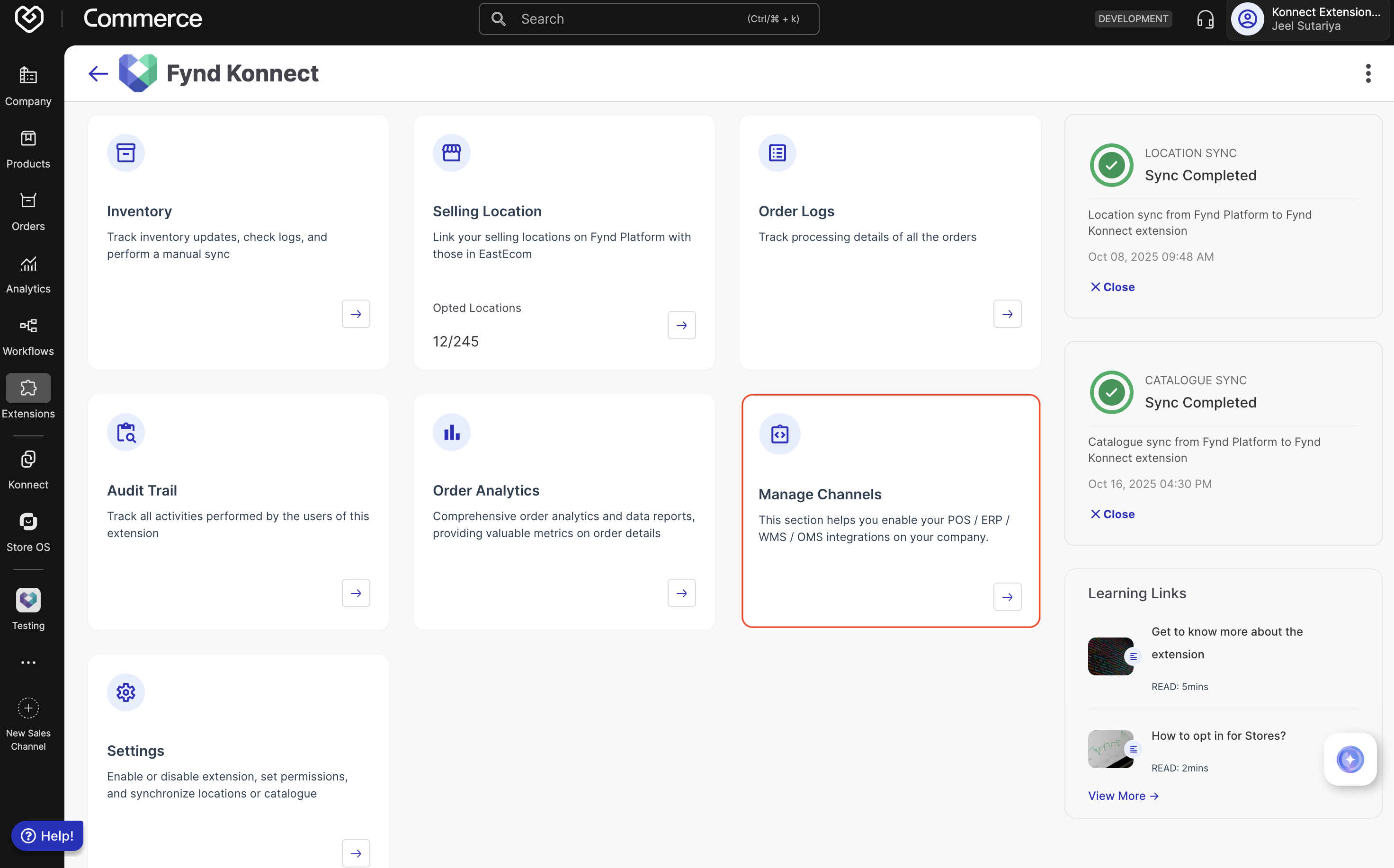 - Manage Channels: From the Fynd Konnect dashboard, click Manage Channels to view all configured seller channels.