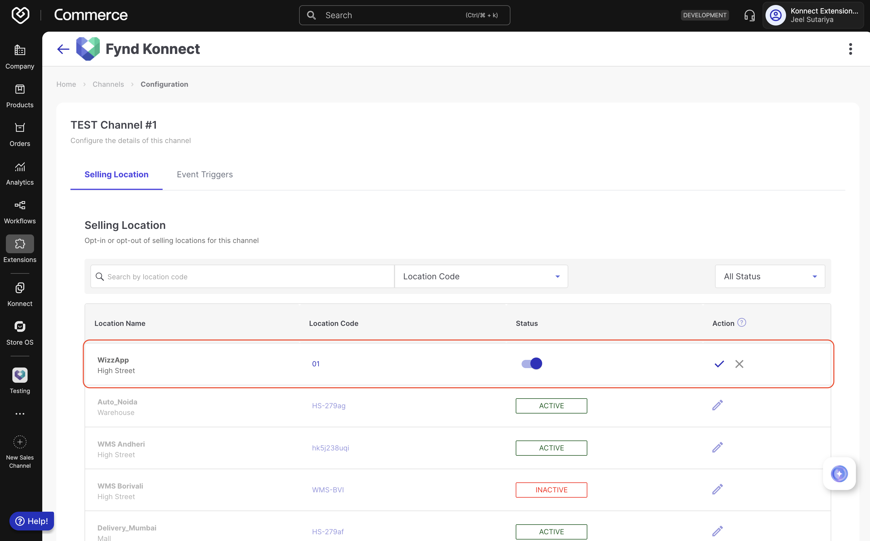 - Activate Selling Locations: In the channel configuration page, navigate to the Selling Location tab. Activate the fulfillment locations for which you want to enable event notifications. Only shipments originating from selected locations will trigger notifications.