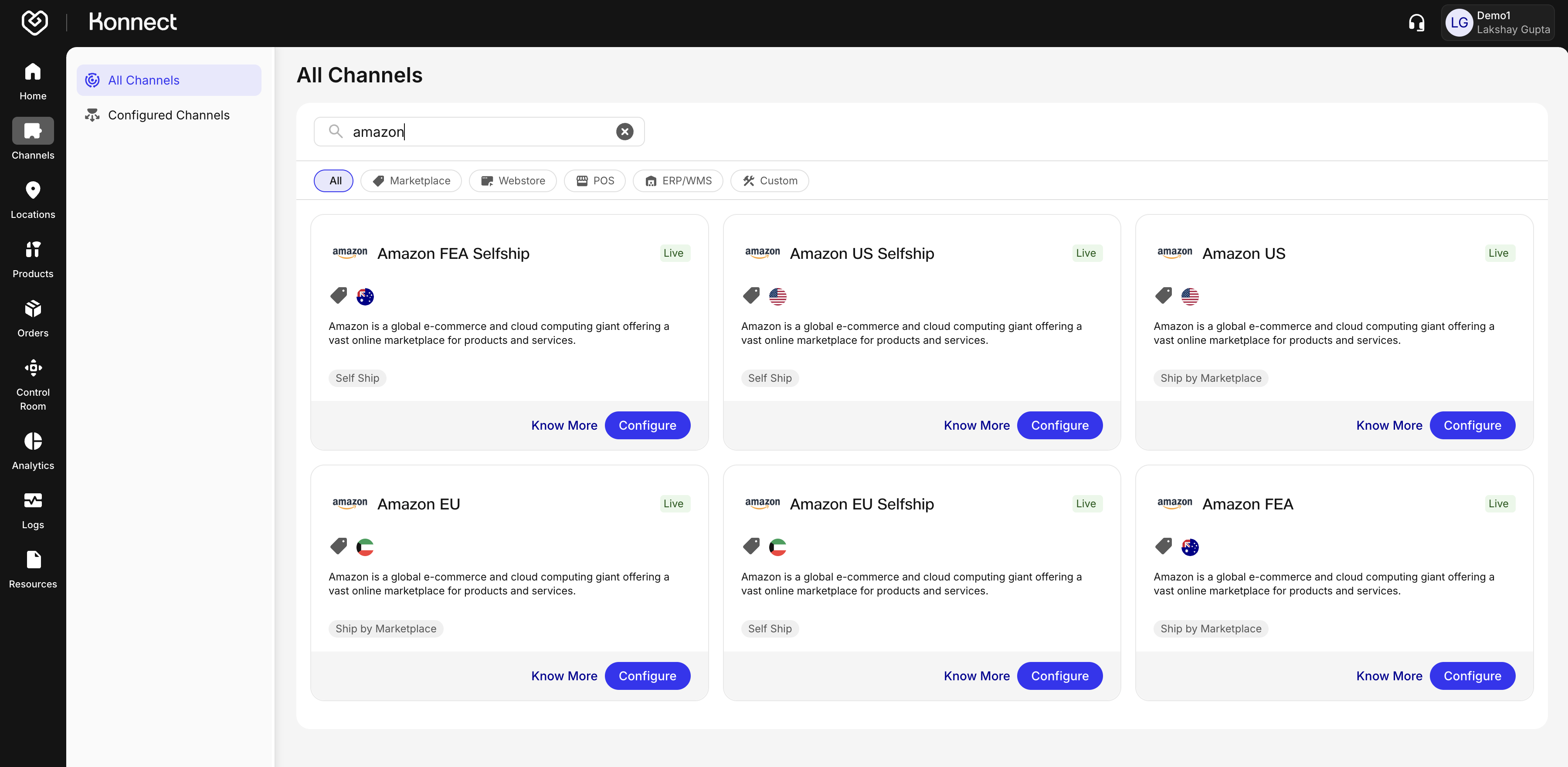 Before configuration on our system, we want to help you understand Amazon flows and regions. When you search for Amazon in the marketplace list, you will see multiple Amazon options. This is because Amazon supports two different fulfillment flows and operates across three major global regions.
