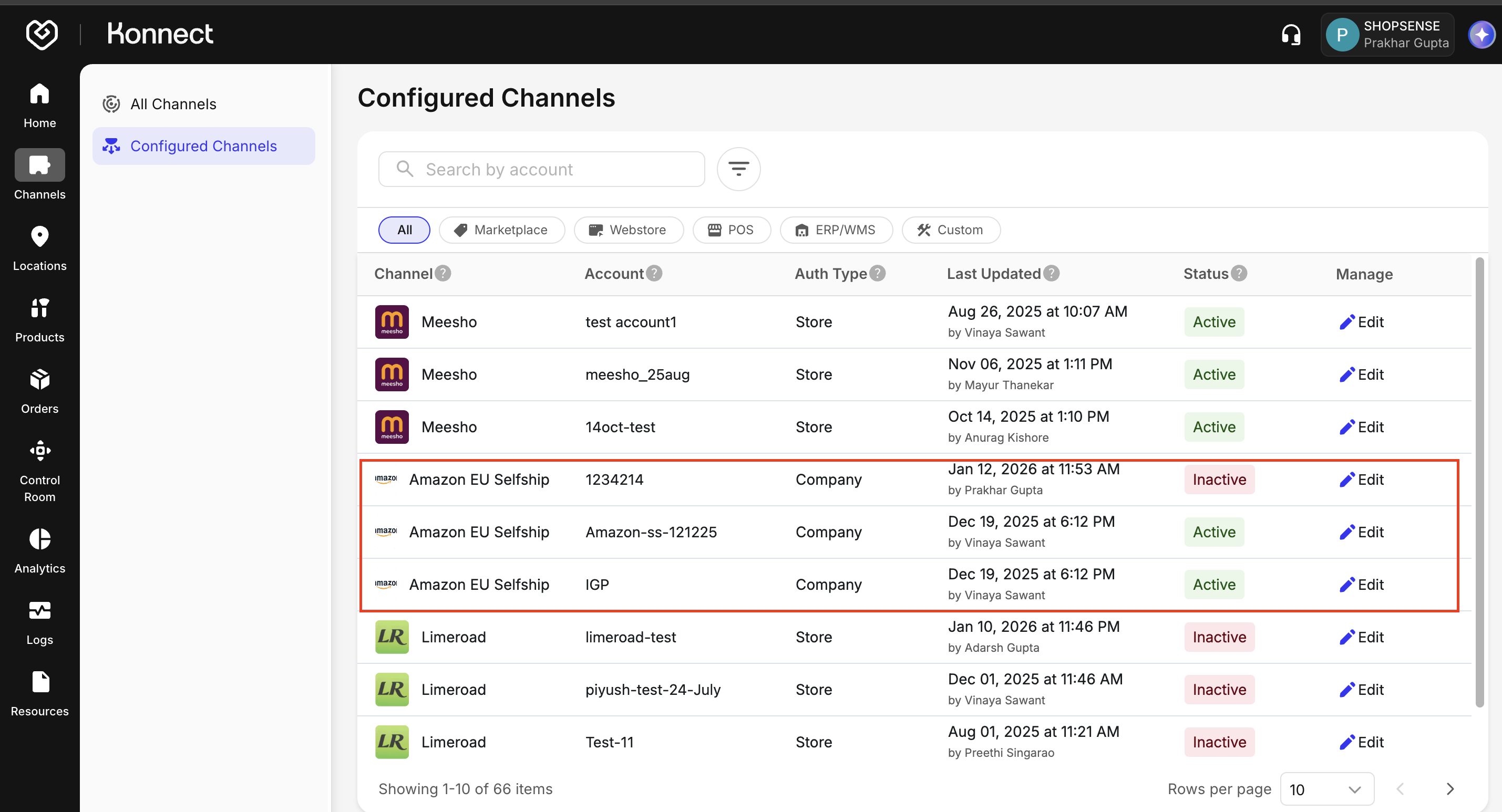 - Locate the Live or Configured channel (e.g., Amazon) you wish to configure.