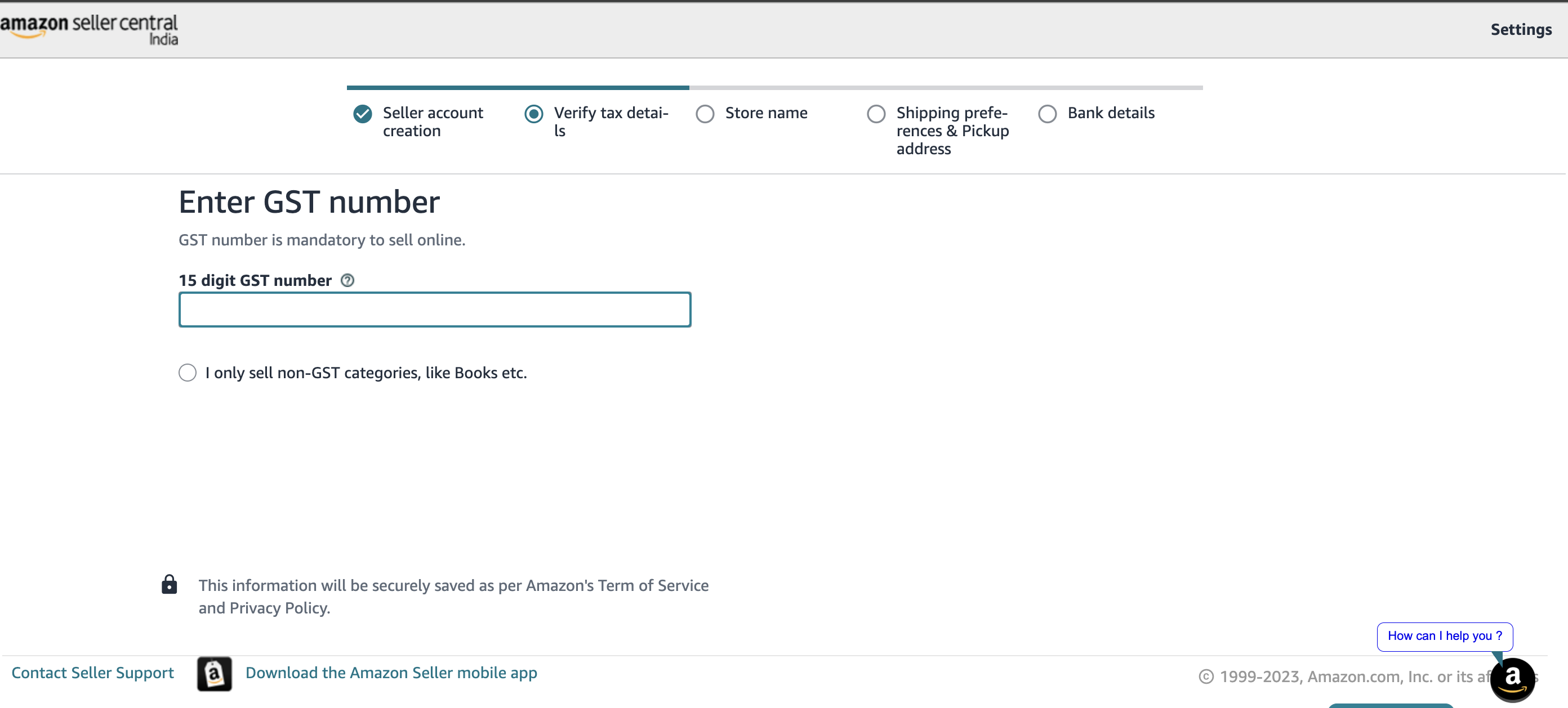 - In this step, you must enter your 15-digit GST number to proceed. If you sell only GST-exempt categories like books, you can select the checkbox stating that you only sell non-GST categories. This allows you to continue without a GST number