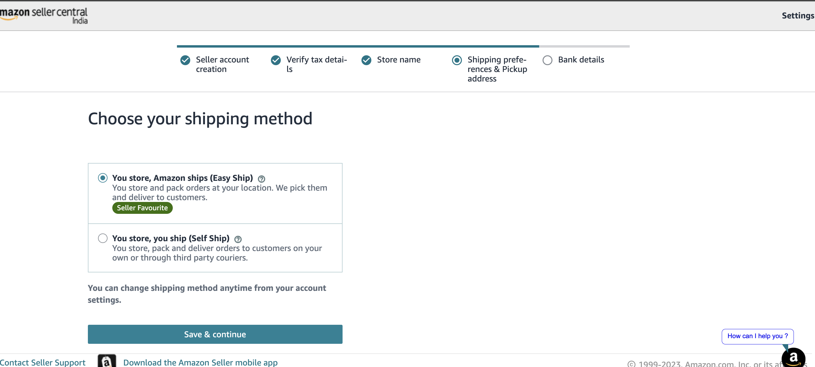 - Choose Your Shipping Method: Select your preferred shipping method. You can choose Easy Ship, where Amazon picks up and delivers your orders, or Self Ship, where you handle delivery through your own or third-party couriers. Choose the method that suits your business and continue