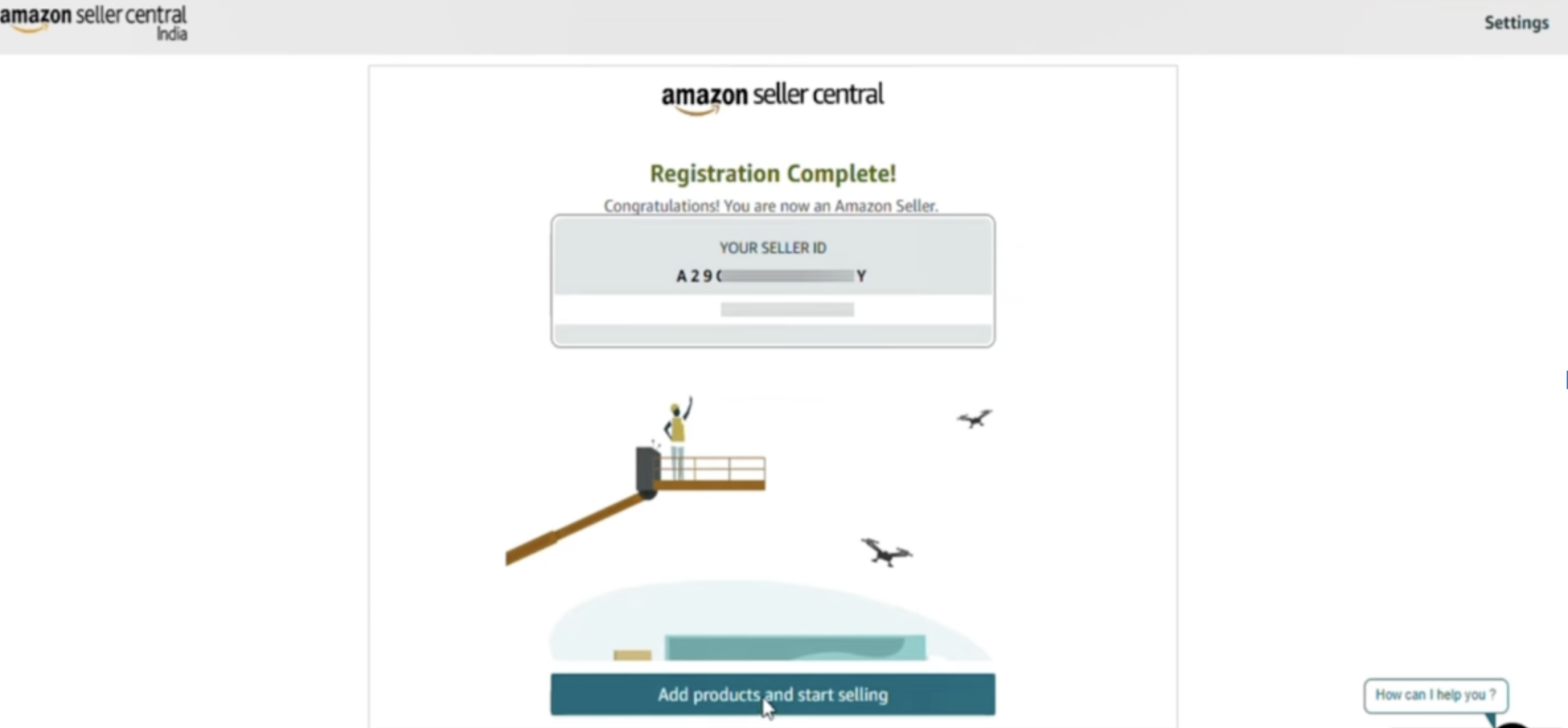 - Registration Complete: Once all steps are completed, your Amazon Seller account is successfully created. Your Seller ID is displayed on the screen. You can now click Add products and start selling to begin listing items and launch your Amazon business