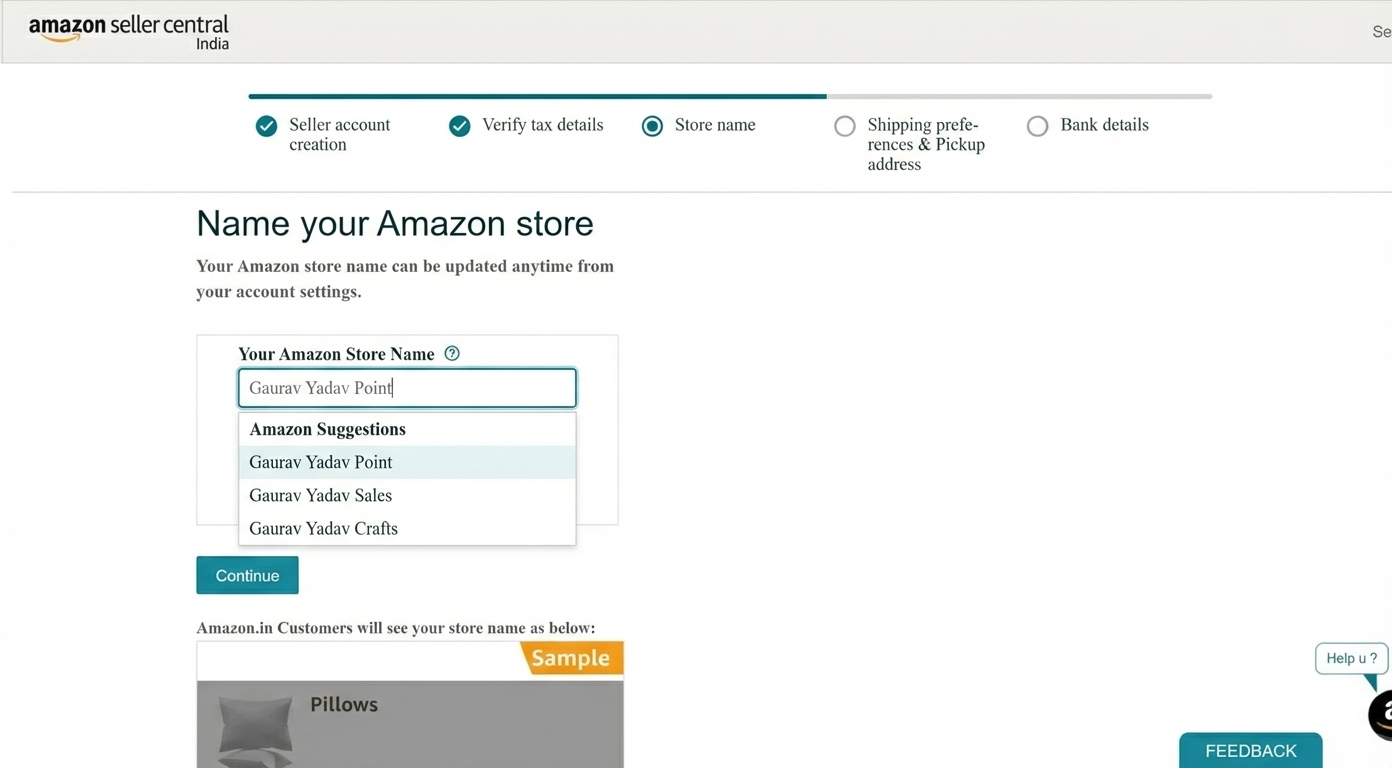 - Enter Store Name: You need to provide a unique name for your Amazon store. Enter your preferred store name in the given field. This is the name customers will see when they browse your products. You can change it later anytime from your account settings